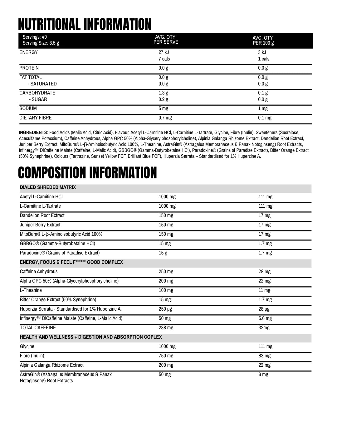With two forms of L-Carnitine (Acetyl-L-Carnitine + L-Carnitine L-Tartrate), Mitoburn®, and GBBGO®, you're targeting fat oxidation and metabolism from multiple angles. Natural diuretics like Dandelion Root and Juniper Berry help flush excess water, while Paradoxine® (Grains of Paradise) ignites thermogenesis to help your body burn more calories throughout the day. Plus, it delivers smooth, clean energy with 288mg of total caffeine from multiple sources, supported by Alpha GPC, Theanine, and Huperzia Serrata for focus that’s razor sharp and mood that’s dialed in.
